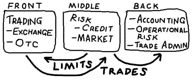 So why did the banks fail to spot this happening? To answer this question let's first examine the inner structure of a bank and describe some of the software solutions required. The trading arm of a bank is usually split into three parts known as the front, middle, and back offices.