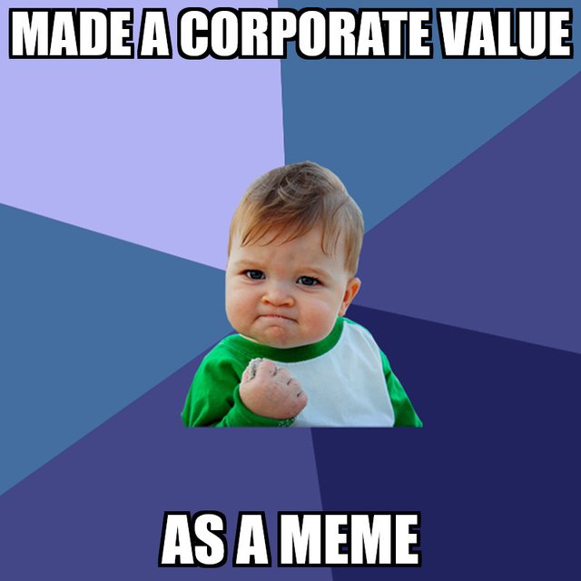 This is perhaps only my second, and hopefully final, time where I play futurist. I'm going to argue that memes are the future of corporate values. You know, those pithy, untruthful, and ignored statements that the senior leadership of your company claim defines their identity and culture. I want to replace them with the inane nonsense that you see across imgur, 9-gag, and icanhascheezburger. I'll show that this brave new world of corporate values as memes has clear benefits and should be embraced by providing real examples of how this amazing future could look. But first lets take a brief recap of the recent history of corporate values.
