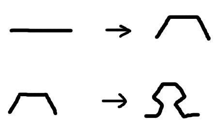 Fractals appear all around us in nature. A fractal is simply a structure or shape that repeats and appears again as you look at it from further back and similarly as you zoom in. We can create a fractal by repeatedly applying a transformation to an initial structure. The fractal we're going to look at is a transformation to a straight line, breaking it up into three straight lines. After a second application we would have nine straight lines, then twenty-seven etc.