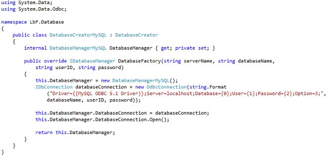 Developers who wish to tailor D-Lighted to connect to different databases are in luck. By using the Abstract Factory pattern, all that needs to be implemented are three functions in two classes (and adding a button to the main XAML window).