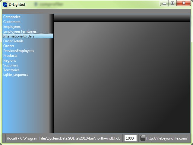 D-Lighted is a free, open-source Windows database tool that allows users to connect to multiple different database platforms all from within the same small executable. The simple, uncluttered user interface is perfect for DBAs or developers who need to get into a database quickly, open up a table and check the data, add or delete a row, or edit some values. D-Lighted currently supports connections to Microsoft SQL, MySQL (thanks to MySQL's .Net Connector), SQLite (thanks to System.Data.SQLite), Oracle and PostgreSQL (thanks to pgFoundary's .Net Data Adapter for PostgreSQL) but visitors to this blog are free to request more in the comments section below. The installers and sourcecode can be found in the downloads section.