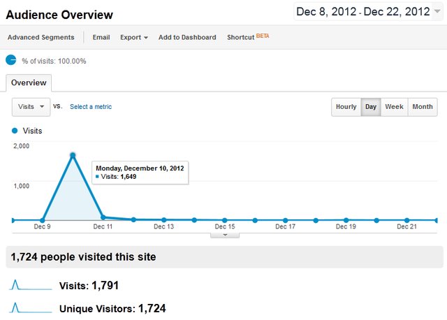 I tracked the amount of traffic to What's New? MUSIC using Google Analytics. In total, the site had 1,724 visitors who stayed for an average time of 40 seconds. Nearly one thousand of the visitors came from the US, ten percent from the UK and a little less from Canada, Germany and then India. The most notable metric though is how quickly the peak wore off. The day after the launch on Hacker News, there were only 80 visitors, then 21 and thereafter fewer than ten each day with literally no visitors a full week later.
