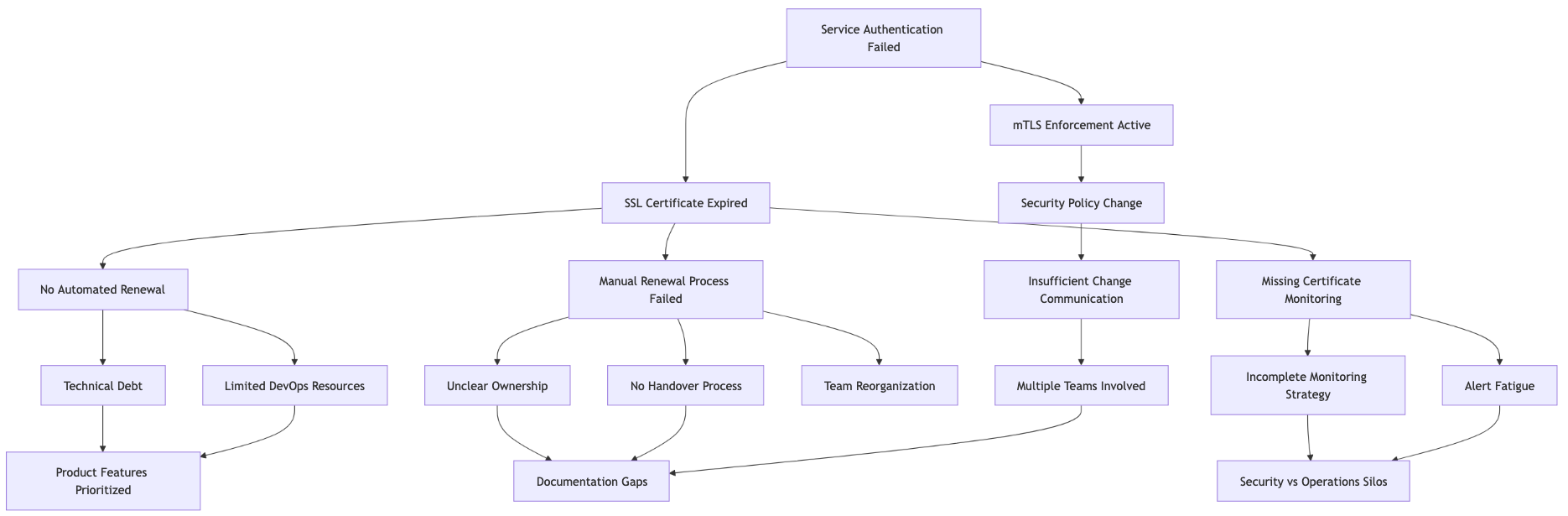 Once you realise there could be multiple paths, your root cause analysis isn’t one path, or even two, but rather it’s a directed acyclic graph. Revisiting the original SSL cert expiry for a service which requires mTLS connections, consider the following root cause analysis as an alternative to 5 Whys. This yields a goldmine of root causes, which makes preventing future incidents much more likely.